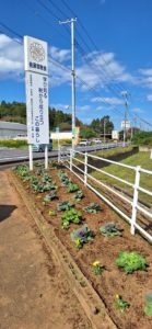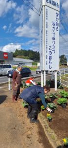 11月3日 標語看板花壇の耕耘と植栽。管理機で耕耘しふかふかの花壇へパンジー、葉ボタンを植栽致しました。場所は、香取市岩部エービン前十字路です。通りすがりの際は、是非ご覧下さい。〈研修委員会・事業委員会〉