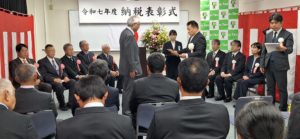 11月14日 佐原税務署に於いて納税表彰式が挙行されました。団体の活動を通じて納税道義の高揚に功績のあった方々に対し表彰状(感謝状)が贈呈されました。同日には、税の標語、税の作文、税の絵はがき等の複合施設コンパス『小野川ホール』にて各種団体代表者、保護者の出席のもと盛大に行われました。